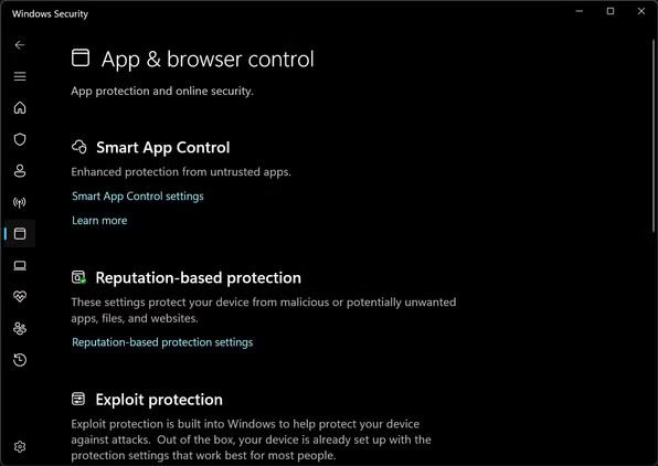 App and Browser Control là hệ thống bảo vệ web tích hợp của Windows, giúp ngăn chặn các bản tải xuống độc hại trước khi chúng đến máy tính của bạn. SmartScreen phân tích các file, trang web và ứng dụng dựa trên cơ sở dữ liệu mối đe dọa của Microsoft theo thời gian thực.