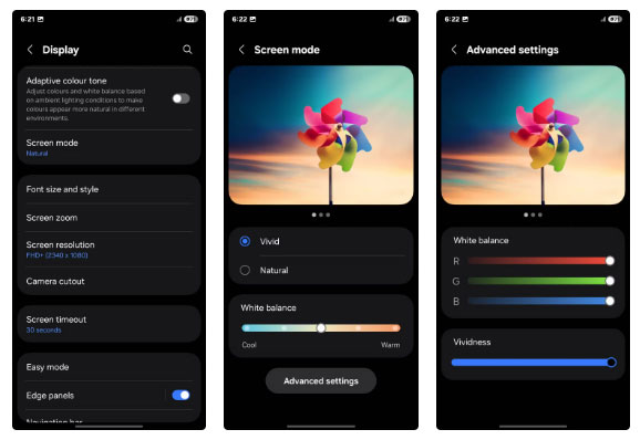 Thay đổi đầu tiên cần thực hiện trong cài đặt hiển thị của S25 Ultra là điều chỉnh Screen mode. Theo mặc định, chế độ này được đặt thành Natural, mang lại giao diện chân thực, nhẹ nhàng - tuyệt vời với một số người. Nhiều người thích màu sắc đậm, rực rỡ, vì vậy họ đã chuyển sang Vivid, tăng tối đa thanh trượt Vividness trong Advanced settings và điều chỉnh White balance cho phù hợp.