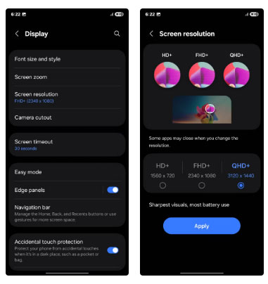 Tiếp theo, hãy xử lý Screen resolution. Khi mở hộp, máy được thiết lập ở chế độ FHD+ (2340x1080), nhưng chiếc điện thoại mạnh mẽ này hỗ trợ QHD+ (3120x1440) để có độ rõ nét tuyệt đẹp. Tuy nhiên, chế độ này có thể làm pin nhanh hết hơn, vì vậy nếu bạn muốn thời lượng pin dài, thì lựa chọn thông minh hơn là gắn bó với FHD+.