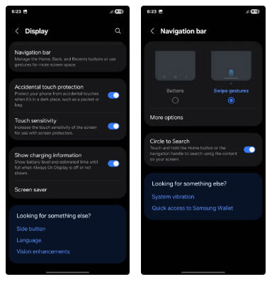 Sau đó là cài đặt Navigation bar. Hãy hoán đổi bố cục Button mặc định thành Swipe gestures và việc di chuyển trở nên mượt mà hơn rất nhiều. Vuốt lên để về trang chủ, giữ để xem những ứng dụng gần đây hoặc vuốt sang trái/phải để chuyển đổi giữa các ứng dụng mang lại cảm giác rất trực quan.