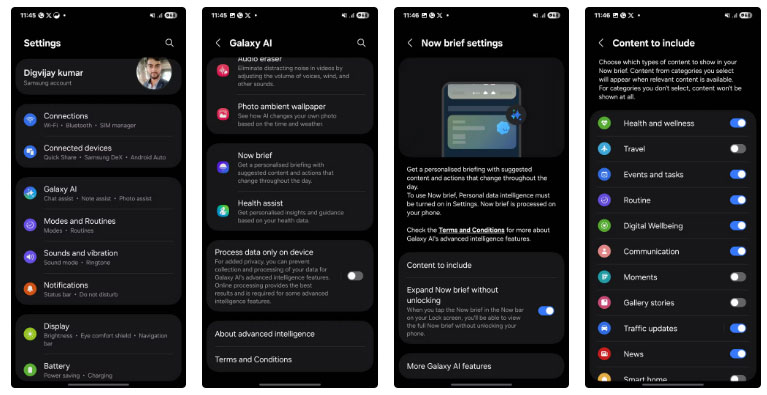 Tính năng tiếp theo cần tùy chỉnh trên Galaxy S25 Ultra là tính năng Now Brief. Nó hiển thị tổng quan về ngày của bạn, bao gồm các sự kiện lịch và thông tin liên quan khác, ngay trên màn hình khóa. Lúc đầu, nó có vẻ lộn xộn với các thông báo ngẫu nhiên mà bạn không quan tâm, nhưng bạn có thể tùy chỉnh nó để chỉ hiển thị những gì mình muốn: