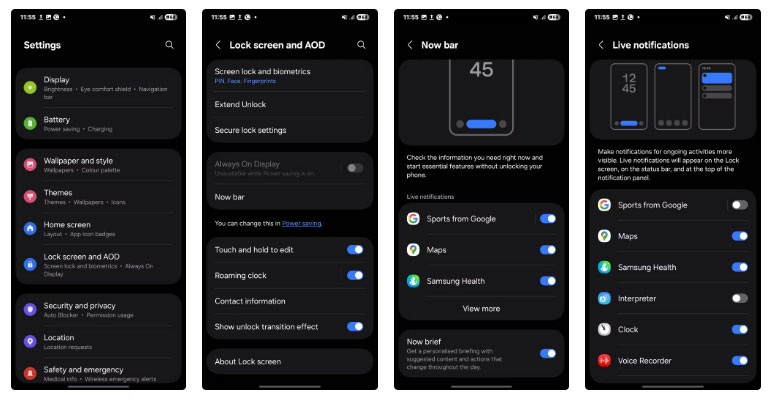 Sau đó là Now Bar, một tính năng bắt buộc phải có khác của One UI 7. Đây là thanh công cụ có thể tùy chỉnh hoàn toàn trên màn hình khóa, cho phép bạn truy cập các bản cập nhật trực tiếp như điều khiển nhạc, bộ đếm thời gian, điều hướng Google Maps hoặc thông báo, v.v... mà không cần mở khóa điện thoại.