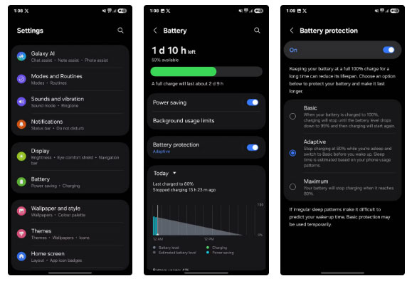 Adaptive là chế độ tiện lợi và hiệu quả nhất vì nó ngăn ngừa tình trạng sạc quá mức và tự động quản lý pin. Để truy cập các chế độ này, hãy vào Settings > Battery > Battery protection, sau đó chọn chế độ phù hợp với bạn.