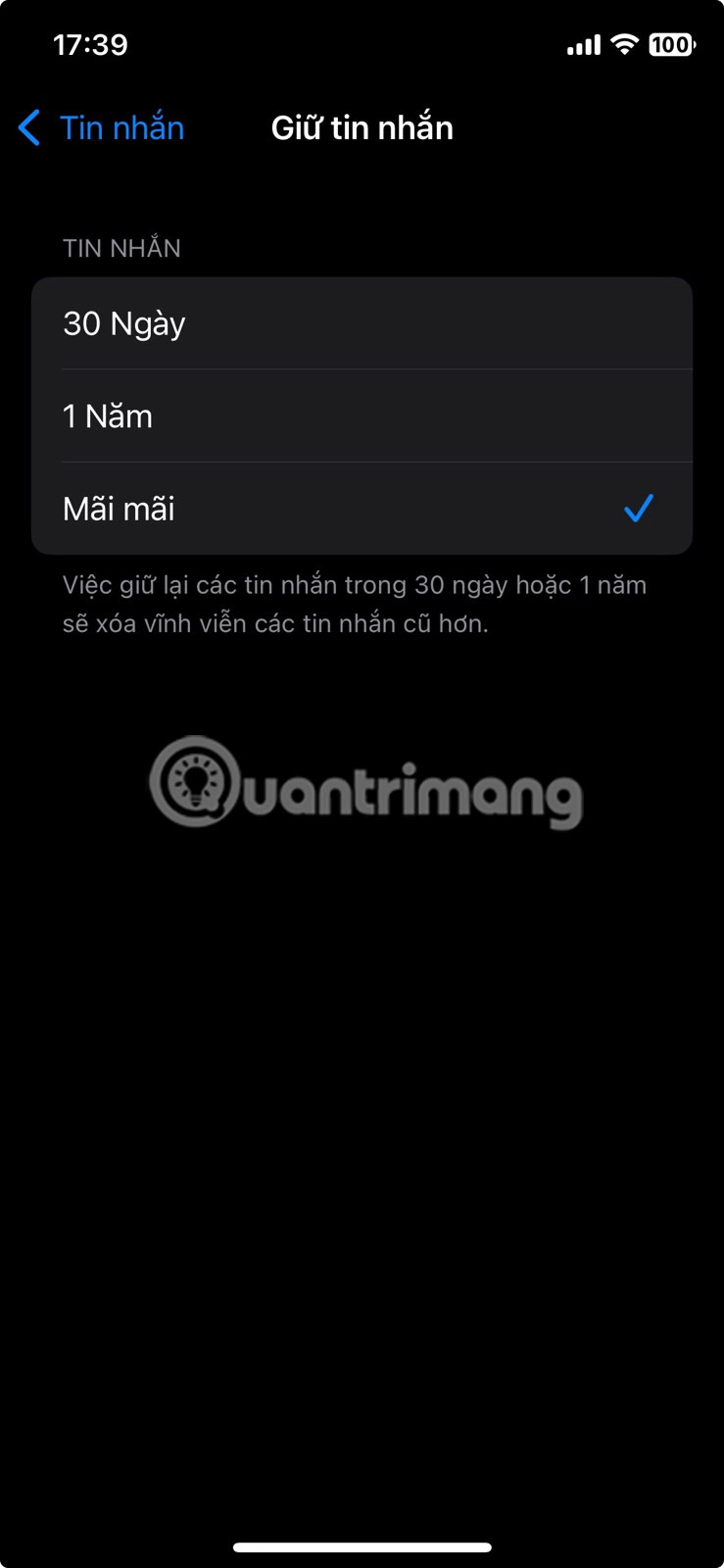 Bạn cũng có thể giới hạn thời gian lưu trữ tin nhắn đã đồng bộ trên iCloud để giải phóng dung lượng. Việc này giúp cân bằng tốt giữa việc đồng bộ các cuộc trò chuyện gần đây và giải phóng dung lượng lưu trữ. Để thực hiện việc này, hãy vào mục Giữ tin nhắn và chọn khoảng thời gian mong muốn.