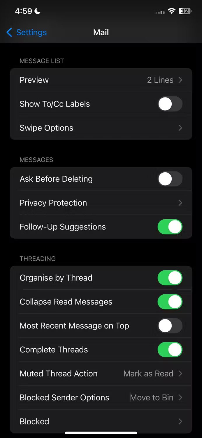 Mặc dù bạn không thể thay đổi thao tác vuốt sang trái mặc định thành bất kỳ thao tác nào khác ngoài thao tác lưu trữ, nhưng bạn có thể thêm các hành động phụ như "gắn cờ", "đánh dấu là đã đọc" hoặc "di chuyển tin nhắn" và áp dụng chúng theo cách thủ công sau khi vuốt sang trái.