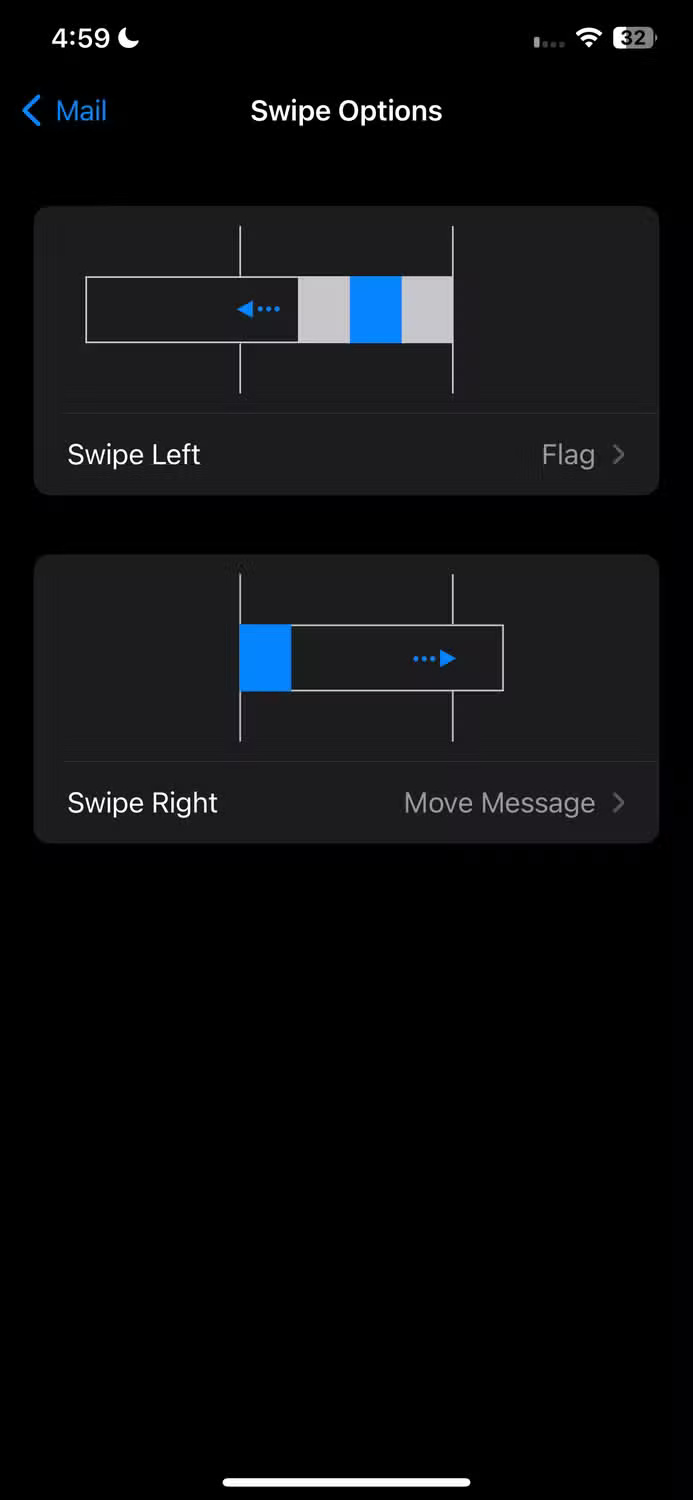 Để điều chỉnh các cử chỉ này, hãy mở Settings > Mail > Swipe Options. Từ đó, nhấn vào "Swipe Right" và "Swipe Left” để sửa đổi các hành động cho từng hướng vuốt.