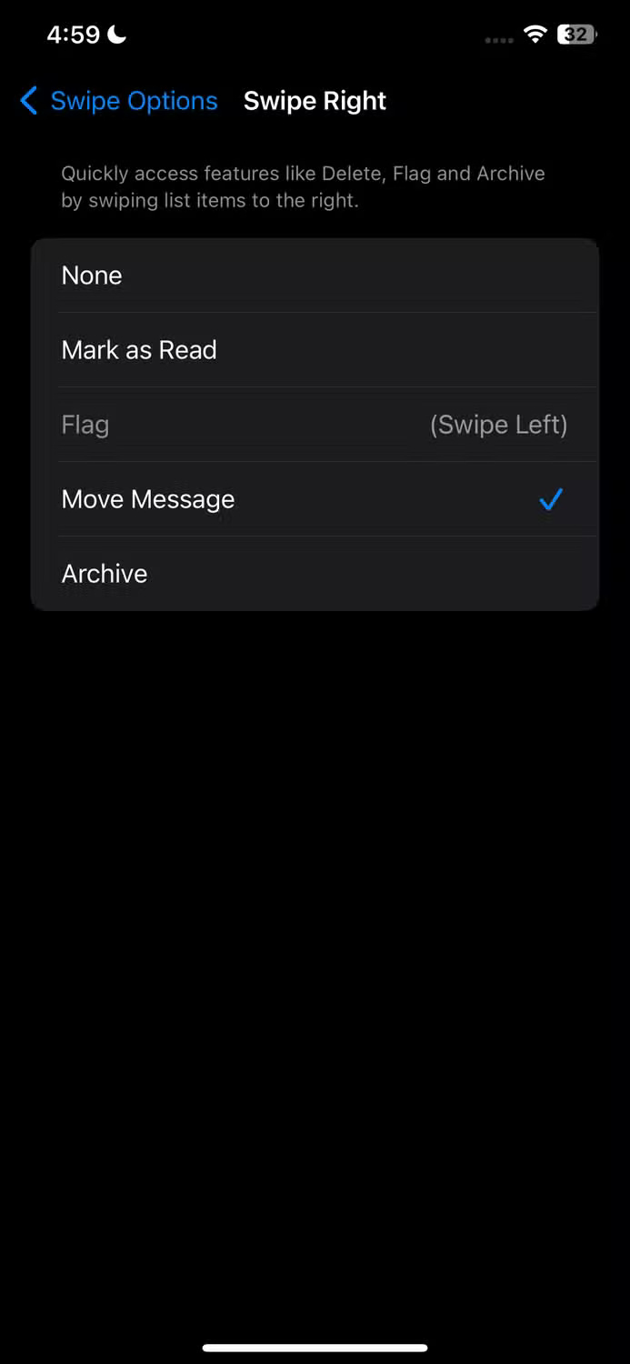 Đối với thao tác vuốt sang phải, bạn có thể thay đổi hành động thành "gắn cờ", "di chuyển tin nhắn" hoặc "lưu trữ". Nếu bạn chọn "lưu trữ" cho thao tác vuốt sang phải, thao tác vuốt sang trái mặc định sẽ tự động chuyển thành "xóa".