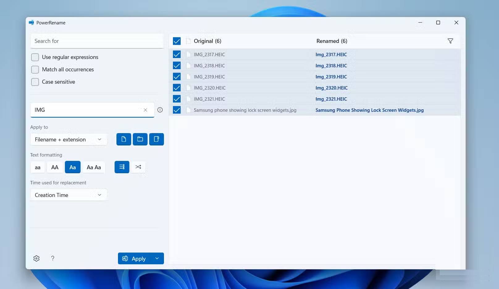 Sau khi nhấp chuột phải vào vùng chọn các file bạn muốn đổi tên và chọn Rename with PowerRename, bạn sẽ nhận được một cửa sổ nơi có thể chỉ định cách bạn muốn đặt tên file. Bạn có thể thêm số thứ tự, chuẩn hóa tên file hoặc thậm chí thay đổi kiểu chữ. Nó cũng cung cấp cho bạn bản xem trước trực tiếp để biết kết quả trước khi xác nhận.