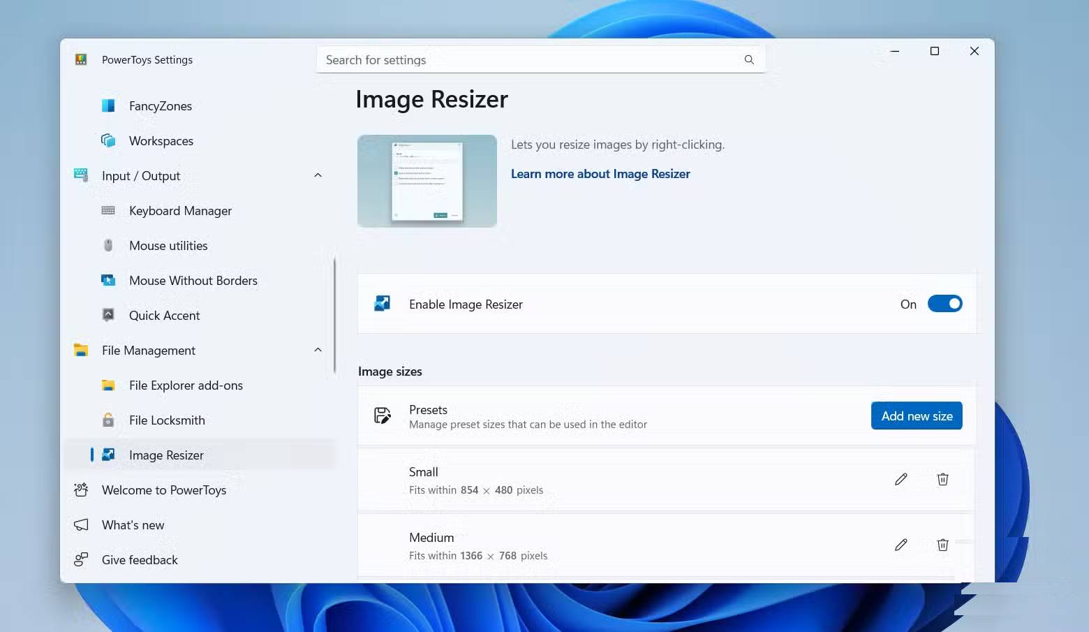 Để kích hoạt các công cụ này, hãy vào PowerToys > File Management > Image Resizer hoặc PowerRename. Bên trong, bạn sẽ tìm thấy một số tùy chọn để tùy chỉnh tính năng.