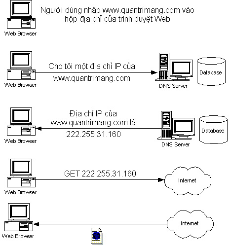 Khi bạn nhập một URL vào trong trình duyệt (ví dụ như www.quantrimang.com) thì trình duyệt sẽ gửi một yêu cầu đến DNS yêu cầu nó trả về địa chỉ IP của site. Đây được gọi là việc tra cứu DNS. Sau khi trình duyệt Web có được địa chỉ IP cho site thì nó sẽ liên hệ với site bằng địa chỉ IP, và hiển thị trang mà bạn vừa yêu cầu. Máy chủ DNS thường có một địa chỉ IP được bản đồ hóa với một tên site nào đó. Trong ví dụ riêng của chúng tôi thì site là www.quantrimang.com bản đồ hóa thành địa chỉ IP là 222.255.31.160.