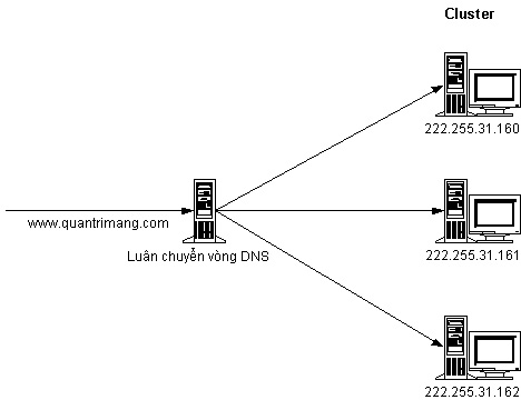 Khi yêu cầu đầu tiên đến được máy chủ DNS, nó sẽ trả về địa chỉ IP 222.255.31.160, máy đầu tiên. Khi có yêu cầu thứ hau, nó sẽ trả về địa chỉ IP thứ hai: 222.255.31.161. Tiếp tục như vậy, với yêu cầu thứ tư, địa chỉ IP đầu tiên lại được lặp lại.