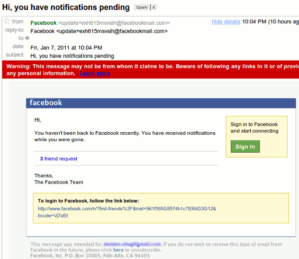 - Nội dung của email: nếu bạn đăng nhập vào FaceBook tối thiểu 1 lần trong ngày, do vậy nếu nhận được thông báo có dạng You haven’t been back to Facebook recently thì chắc chắn đó là giả mạo. Bên cạnh đó, nếu có thông báo như 3 pending friends requests thì cũng không thể tin tưởng được.
