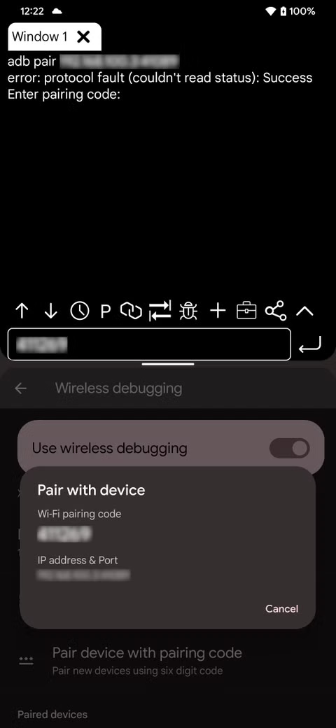 Lúc này, cửa sổ pop-up Pair with device chắc hẳn đã thoát, vì vậy bạn cần mở lại tùy chọn Pair device with pairing code trên trang Wireless Debugging. Nhập địa chỉ IP được hiển thị vào ô nhập liệu ứng dụng ADB Shell tương ứng và làm tương tự với số cổng gồm 5 chữ số, được phân tách bằng dấu hai chấm. Nhớ bật nút chuyển đổi Pair Mode.