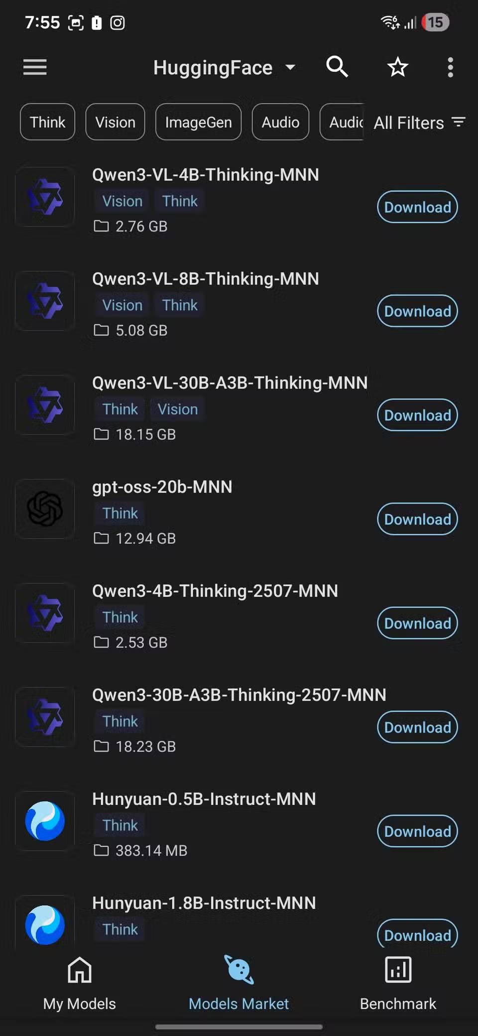 Việc thiết lập MNN Chat thực ra khá dễ dàng. Tất cả những gì bạn cần làm là mở ứng dụng và truy cập vào Models Market. Tại đây, bạn sẽ thấy toàn bộ danh sách các mô hình có sẵn mà bạn có thể tải xuống thông qua Hugging Face. Nếu bạn chưa biết Hugging Face là gì, thì về cơ bản đó là một trong những kho lưu trữ mô hình AI mã nguồn mở lớn nhất.