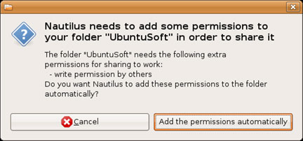 Trong hộp thoại cảnh báo về permission, bạn bấm nút Add the permissions automatically để trình quản lý file Nautilus tự động bổ sung quyền cho thư mục mà bạn vừa chia sẻ.