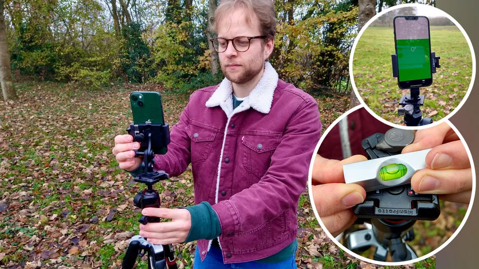Cách hiệu quả nhất để thực hiện việc này là tháo đầu tripod và đặt một thước thủy tinh nhỏ lên tấm lắp – ngay phía trên chân. Sau đó, bạn có thể kéo dài hoặc rút từng chân riêng lẻ cho đến khi tấm lắp cân bằng. Nếu không có thước thủy tinh, bạn có thể sử dụng ứng dụng Đo trên iPhone của mình. Khi thiết bị ở vị trí thẳng đứng, nó có thể được sử dụng để làm thẳng các đường chân trời.