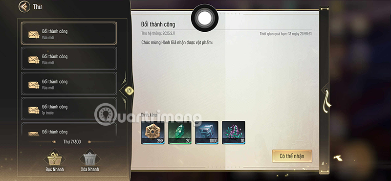 Bước 2: Trong đây sẽ bao gồm các thư được gửi về từ nhà phát triển game, đồng thời có cả thư được gửi từ việc đổi code.