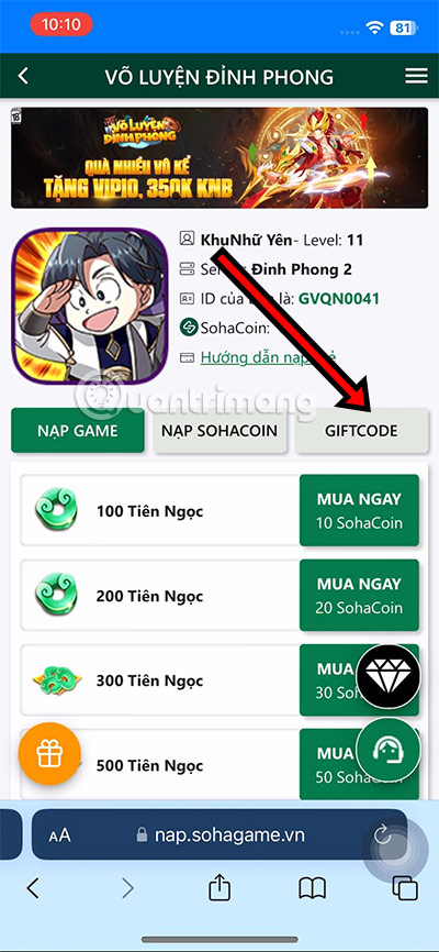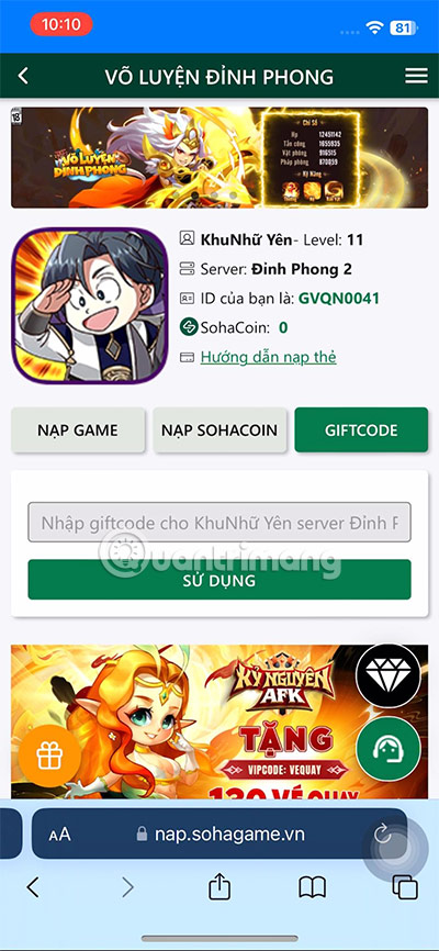 B1: Đầu tiên đăng nhập tài khoản đã chơi game vào đường link ở dưới đây.
