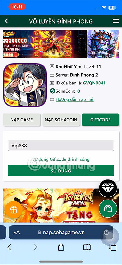 Nếu code bạn nhập còn trong thời gian sử dụng, bạn sẽ thấy ngay thông báo Sử dụng Giftcode thành công.