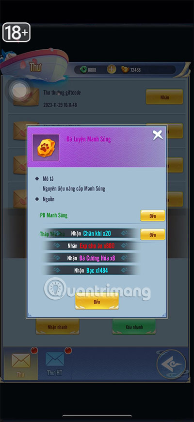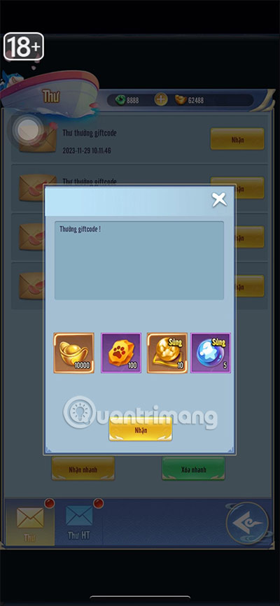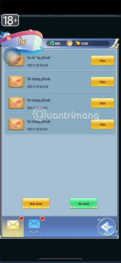 Chọn Thư để kiểm tra lại các thư giftcode, bạn có thể chọn Nhận riêng từng thư. Hoặc chọn Nhận Nhanh để nhận toàn bộ thư trong gift code.