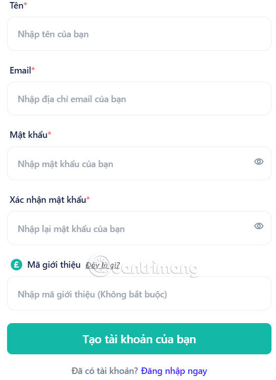 Hiển thị giao diện để bạn điền thông tin cá nhân của mình để tạo tài khoản ChatbotX.