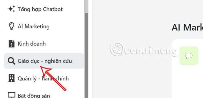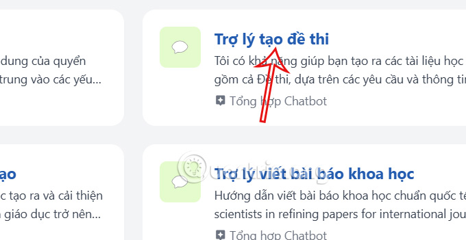 Trong giao diện này bạn sẽ thấy có nhiều tùy chọn trợ lý cho Giáo dục, bạn nhấn vào mục Trợ lý tạo đề thi để thực hiện tạo đề thi AI.