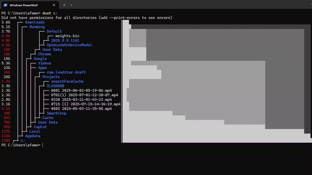 Nếu bạn chạy lệnh dust c:, công cụ sẽ quét ổ C, hiển thị kết quả quét theo định dạng trực quan. Bạn sẽ thấy kích thước thư mục, tỷ lệ sử dụng và biểu diễn thanh trực quan. Bạn có thể thêm flag để tận dụng tối đa lệnh này. Ví dụ, sử dụng dust -d 2 để giới hạn việc quét ở hai cấp thư mục con - thư mục hiện tại và hai cấp tiếp theo. Flag này cho phép bạn tập trung vào mức tiêu thụ dung lượng cấp cao mà không bị quá tải bởi từng file. Sử dụng dust -r để khôi phục thứ tự sắp xếp.