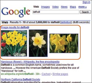Khi thử cùng truy vấn với Ask.com, Microsoft Live Search và Yahoo, không có dịch vụ nào hiển thị được một bức ảnh của bông hoa này trong kết quả. Để công bằng, NTN thực hiện tìm kiếm tương tự dùng cụm từ "Eiffel Tower" (tháp Eiffel); lần này, Google, Ask.com và Yahoo hiển thị ít nhất một bức ảnh của biểu tượng Paris, nhưng Live Search thì không. (Tuy nhiên, Live Search có cho truy cập đến các hình ảnh của biểu tượng này thông qua một liên kết "Eiffel Tower Photos" trong phần Related Searches).