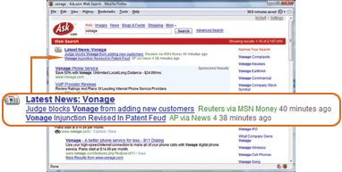 Bạn sẽ có được các liên kết đến những tin bài gần đây có liên quan đến truy vấn ở đầu trang kết quả khi dùng Ask.com |