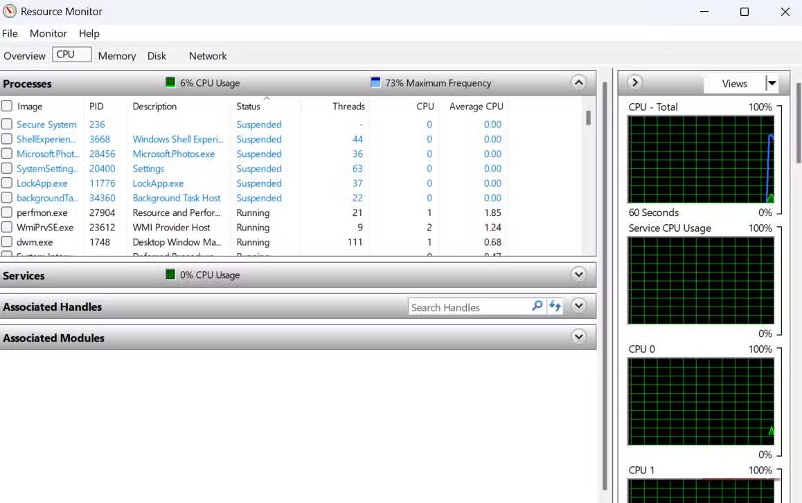 Đúng như tên gọi, Resource Monitor là cách PC theo dõi từng chút tài nguyên phần cứng và hệ thống đang được sử dụng. Công cụ tích hợp mạnh mẽ này cung cấp cho bạn cái nhìn thời gian thực về CPU, bộ nhớ, ổ đĩa và hoạt động mạng, tất cả tại một nơi.
