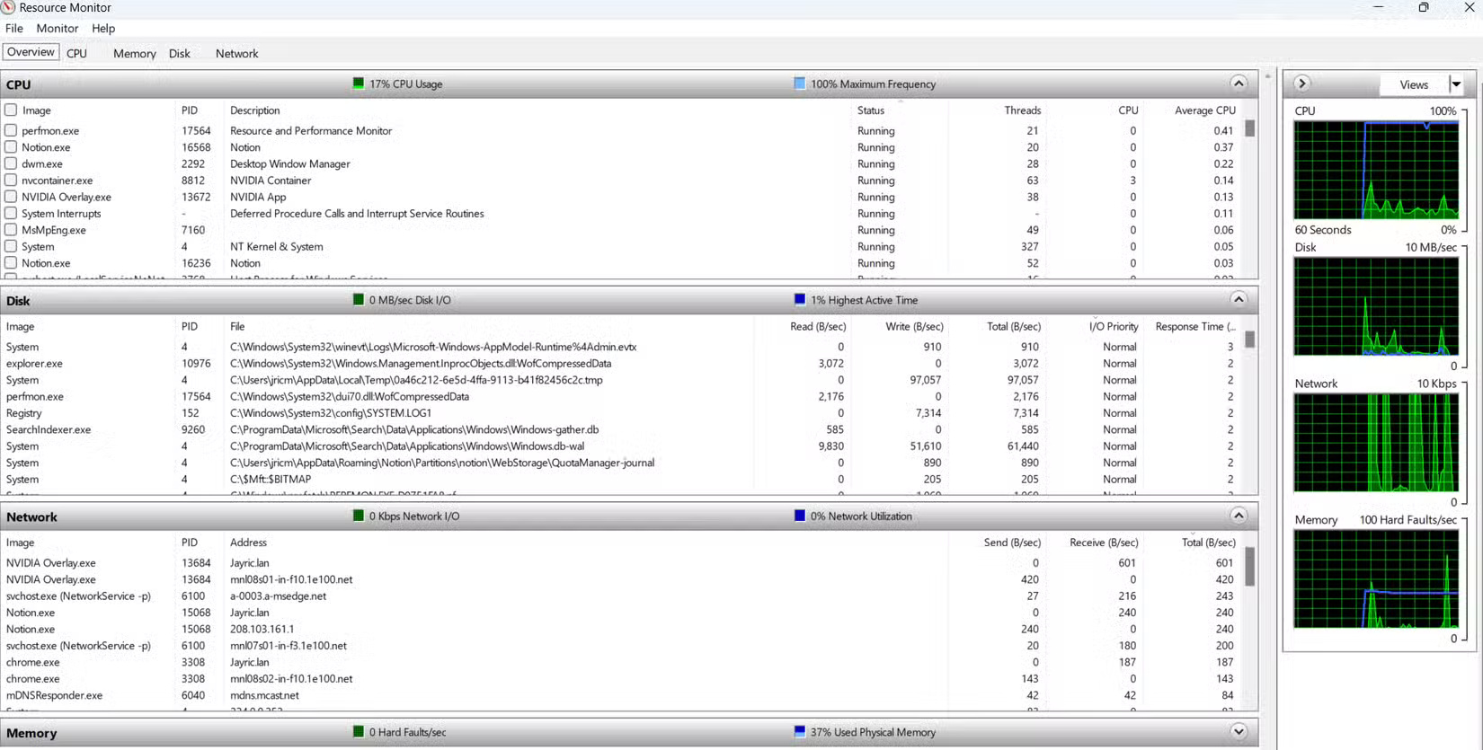 Nếu chỉ sử dụng tab Performance của Task Manager, bạn có thể xem nhanh tổng quan về mức sử dụng hệ thống. Với Resource Monitor, bạn sẽ xác định chính xác ứng dụng và quy trình gây ra tình trạng chậm máy và các file mà chúng đang truy cập.