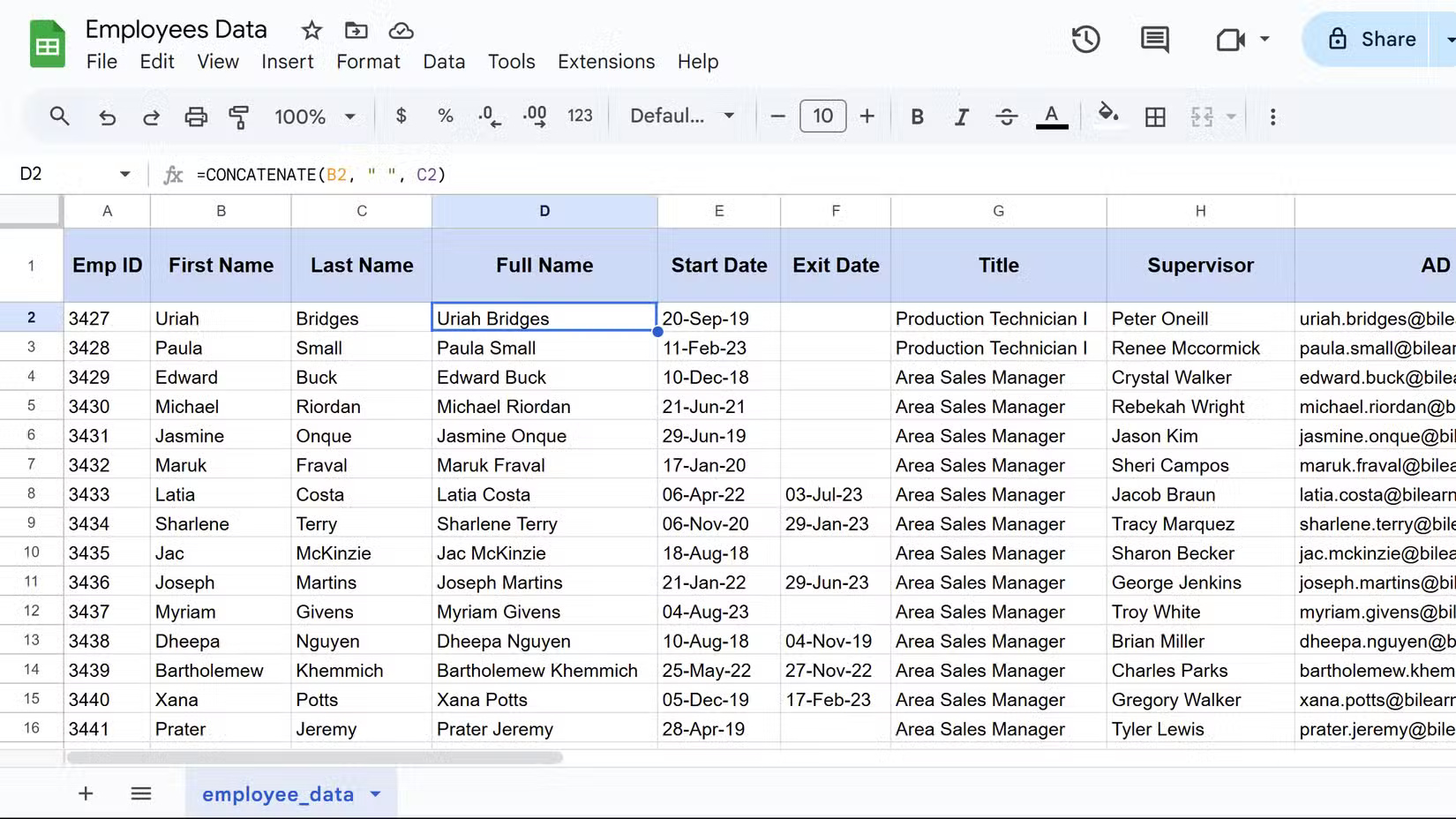 =CONCATENATE(B2, " ", C2)Công thức này kết hợp các giá trị từ ô B2 và C2, cách nhau bởi một khoảng trắng. Công thức này hoàn hảo để tạo tên đầy đủ, mã sản phẩm, địa chỉ đã định dạng, v.v...