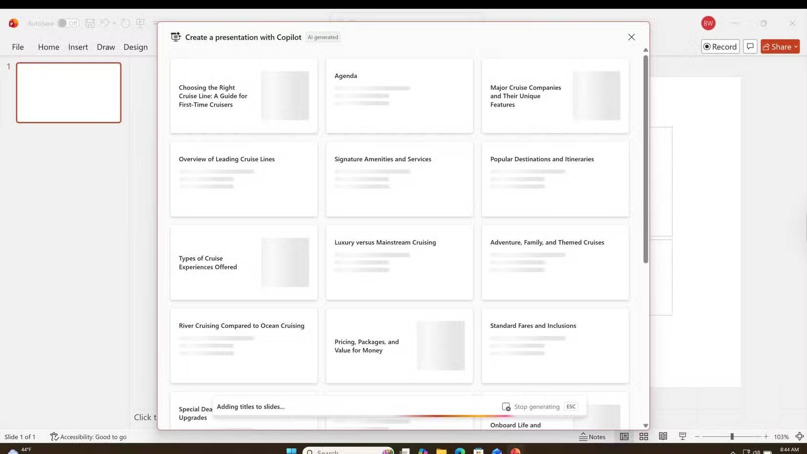 Để bắt đầu sử dụng Copilot trong Powerful, bạn chỉ cần chọn tùy chọn Create with Copilot, vì không cần phải chuyển đổi giữa các ứng dụng hoặc sao chép và dán bất cứ thứ gì. Sau đó, hãy đưa ra cho trợ lý một yêu cầu khá chi tiết, yêu cầu nó tạo một bài thuyết trình về các công ty du thuyền. Bài thuyết trình cần đề cập đến đối tượng khách hàng mục tiêu của mỗi hãng lớn, những yếu tố quan trọng cần cân nhắc khi chọn một chuyến du thuyền và các hoạt động giải trí có sẵn trên tàu. Nếu không muốn bài thuyết trình quá dài, hãy đặt giới hạn 12 slide. Bằng cách này, bài thuyết trình sẽ không quá cồng kềnh và khó quản lý.