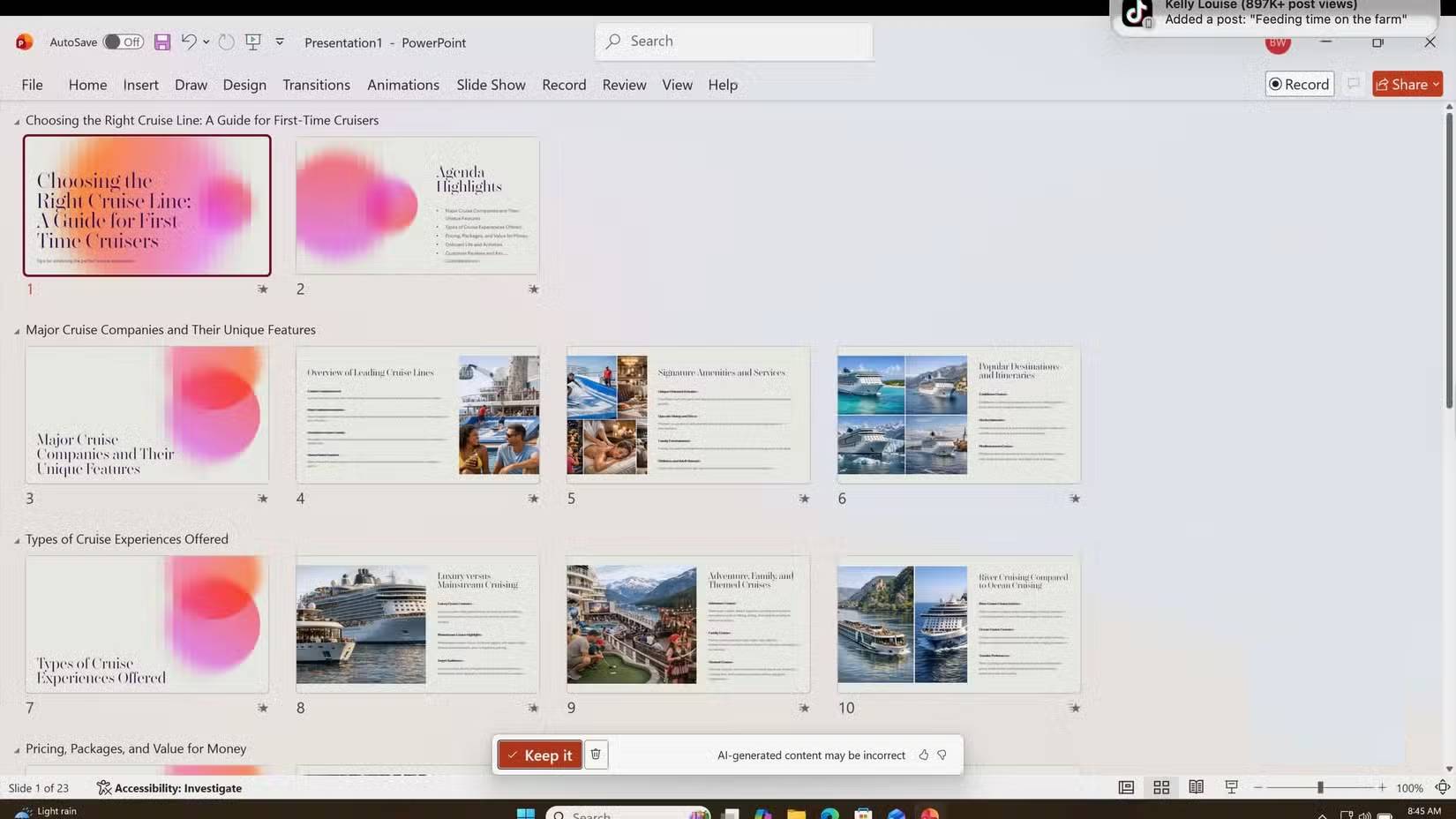 Gần đây, một người dùng đã quyết định sử dụng Copilot để tạo một bài thuyết trình PowerPoint cho công việc bán thời gian mới của mình: Tư vấn du lịch. Mục tiêu là thiết kế một bài thuyết trình về các hãng tàu du lịch hàng đầu thế giới, bao gồm thông tin về những hãng này, lĩnh vực hoạt động chính và loại hình du lịch mà họ nhắm đến.