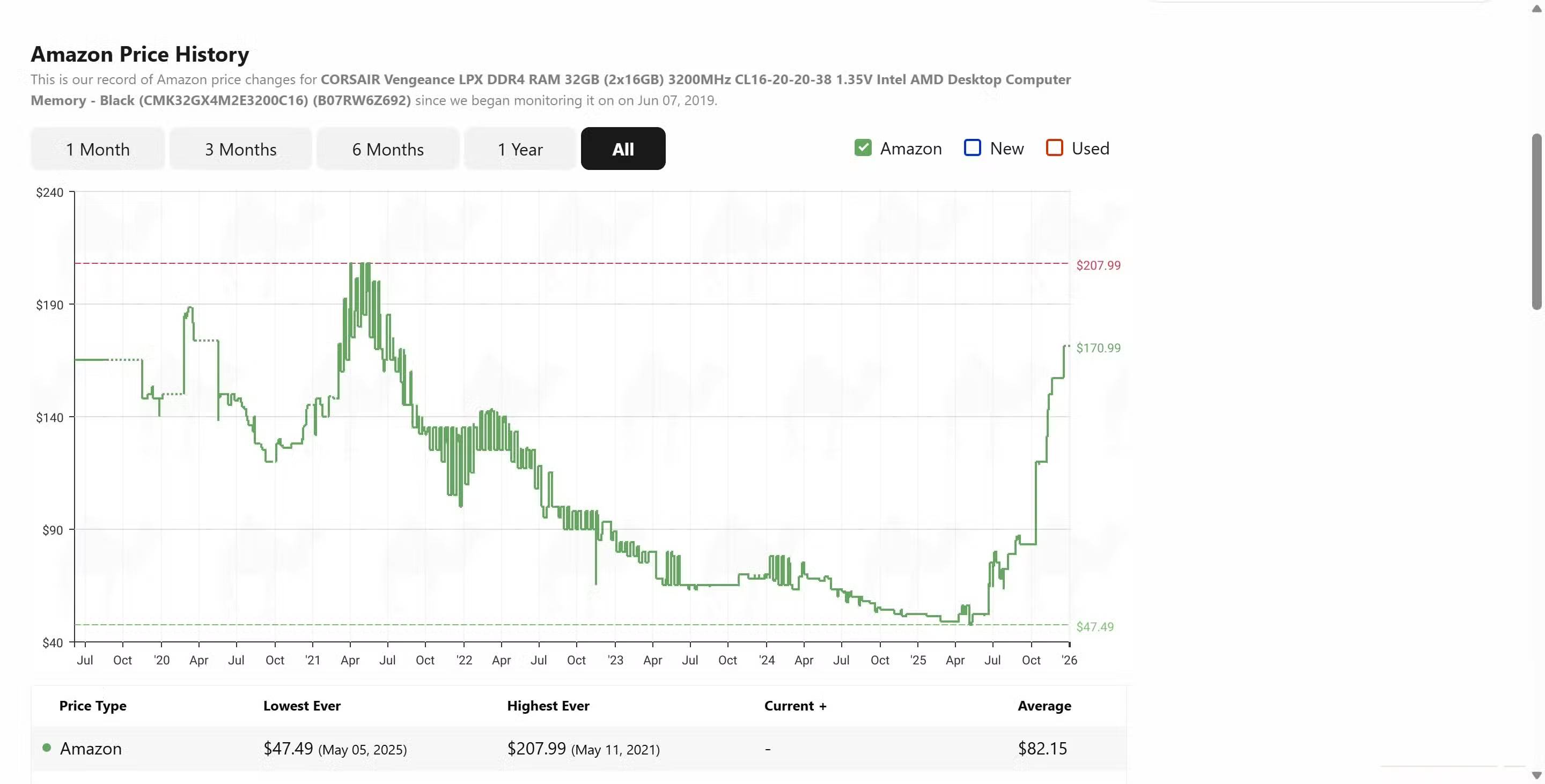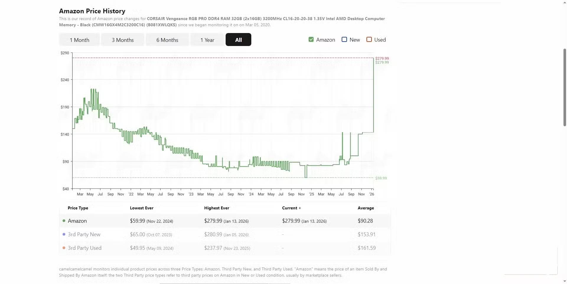 Ví dụ, giá của RAM CORSAIR Vengeance DDR4 32GB đã tăng từ khoảng 90 USD vào tháng 10 năm 2025 lên khoảng 170 USD vào tháng 1 năm 2026, trong khi RAM CORSAIR Vengeance RGB PRO DDR4 32GB (phiên bản RGB) tăng từ khoảng 90 USD lên 280 USD trong cùng thời kỳ.