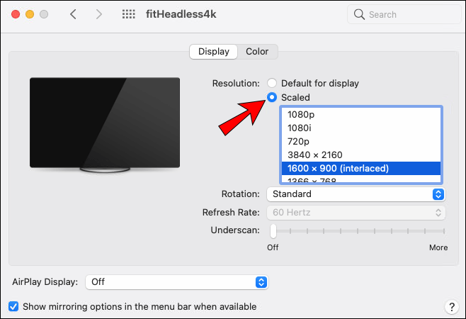 3. Tiếp theo, nhấp vào tùy chọn Scaled để tắt nó. Cuối cùng, chọn độ phân giải khác từ danh sách.