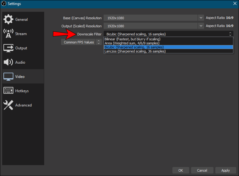 3. Tìm hộp thoại có nhãn Downscale Filter để truy cập danh sách các bộ lọc. Có một số tùy chọn để lựa chọn. Tuy nhiên, bộ lọc được khuyến nghị là Lanczos. Hãy nhớ rằng nó có thể gây tải nặng cho CPU và GPU của bạn. Nếu bạn muốn một phiên bản nhẹ hơn, hãy thử Bicubic. Hai bộ lọc còn lại, Bilinear và Area, hơi lỗi thời.