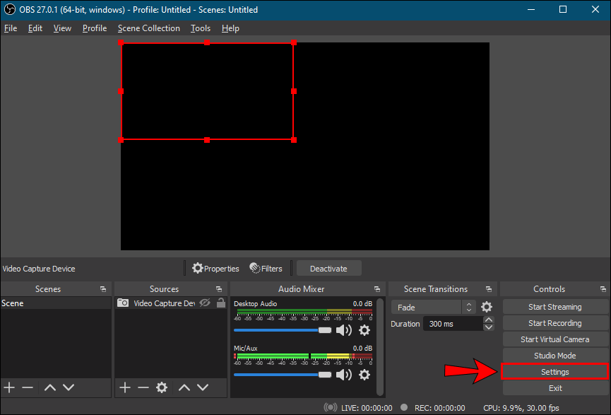 1. Khởi chạy OBS và nhấp vào Settings ở góc dưới bên phải màn hình.