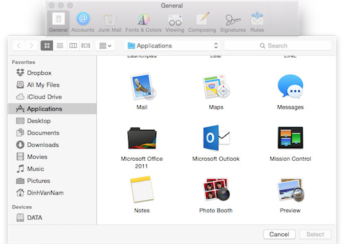 Bước 3: Nếu ứng dụng đọc email mong muốn không có sẵn trong menu, bấm nút Select... Một cửa sổ hiện lên cho phép người dùng chỉ đường đến phần mềm email cần dùng.