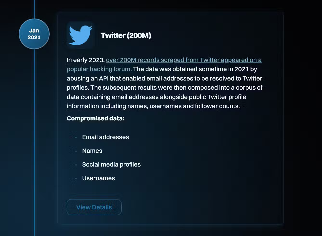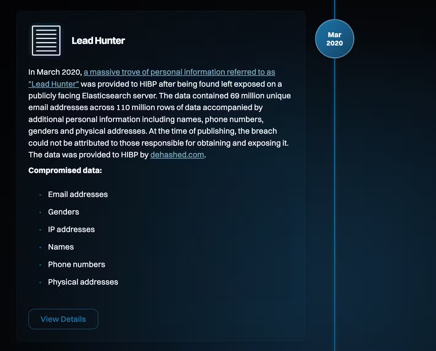 Đây là một công cụ hữu ích để phát hiện cách dữ liệu của bạn đã bị xâm phạm. Địa chỉ email, tên người dùng và siêu dữ liệu bị rò rỉ có thể được sử dụng lại trong các cuộc tấn công phishing, tấn công chiếm đoạt thông tin đăng nhập và tấn công social engineering. Bạn được cung cấp bối cảnh về nơi thông tin của mình bị rò rỉ, điều này cho phép bạn quyết định cách phản ứng tốt nhất bằng cách thay đổi thói quen và, khi cần thiết, thông tin đăng nhập của mình.