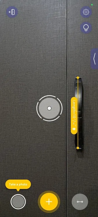Để thực hiện phép đo, hãy bắt đầu một dự án mới và hướng camera về một đầu của vật thể. Nhấn nút dấu cộng màu vàng (+) để bắt đầu đo, di chuyển đến đầu kia và nhấn nút dấu cộng (+) một lần nữa. Nó sẽ hiển thị tổng kích thước của vật thể. Bạn có thể chọn đơn vị đo ưa thích của mình từ Settings ở góc trên bên phải.