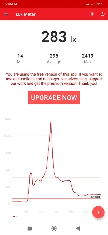 Ứng dụng sử dụng cảm biến ánh sáng của điện thoại để kiểm tra độ rọi ở một vị trí cụ thể. Nếu cần chụp ảnh bất kỳ vật thể hoặc khu vực nào, bạn có thể đưa điện thoại của mình ra trước vật thể đó để đo độ rọi (lx). Ứng dụng hiển thị độ rọi hiện tại với biểu đồ ở phía dưới cho thấy toàn bộ lịch sử thay đổi.