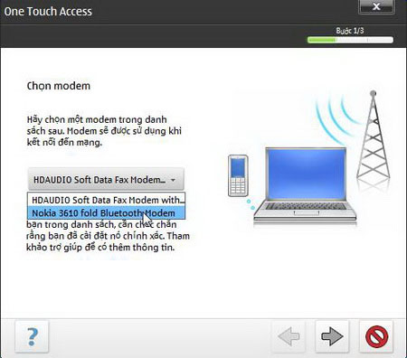 Cửa sổ One Touch Access hiện ra. Bạn nhắp chuột trái chọn “modem/điện thoại” để kết nối internet. |