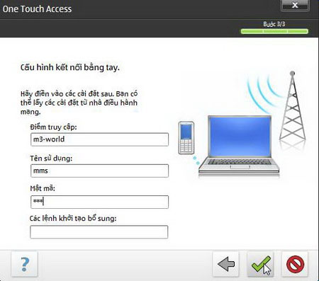 Bạn nhập các thông số cho cấu hình kết nối mạng vào các khung. Sau khi hoàn tất nhắp chuột để quay trở lại giao diện One Touch Access |