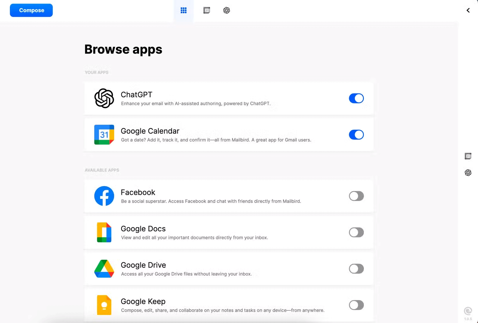 - Đi đến biểu tượng Browse apps ở đầu giao diện Mailbird.