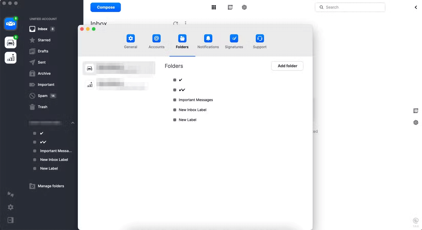 Cách Mailbird cho phép chọn các thư mục muốn hiển thị ở phía bên trái cũng được nhiều người đánh giá cao. Bên cạnh việc chọn từ các tin nhắn quan trọng nhất và những nhãn khác nhau, bạn cũng có thể tạo các thư mục tùy chỉnh cho từng hộp thư đến nếu cần; những thư mục này có thể truy cập bằng cách mở rộng thêm thanh công cụ bên trái.