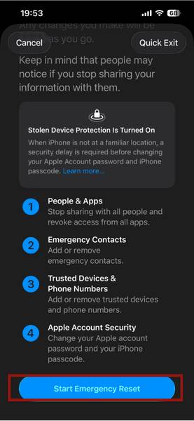 Tùy chọn Emergency Reset giả định rằng mọi thứ đã bị xâm phạm và reset tất cả các quyền chia sẻ về trạng thái an toàn và riêng tư nhất. Để kích hoạt, hãy mở Settings.