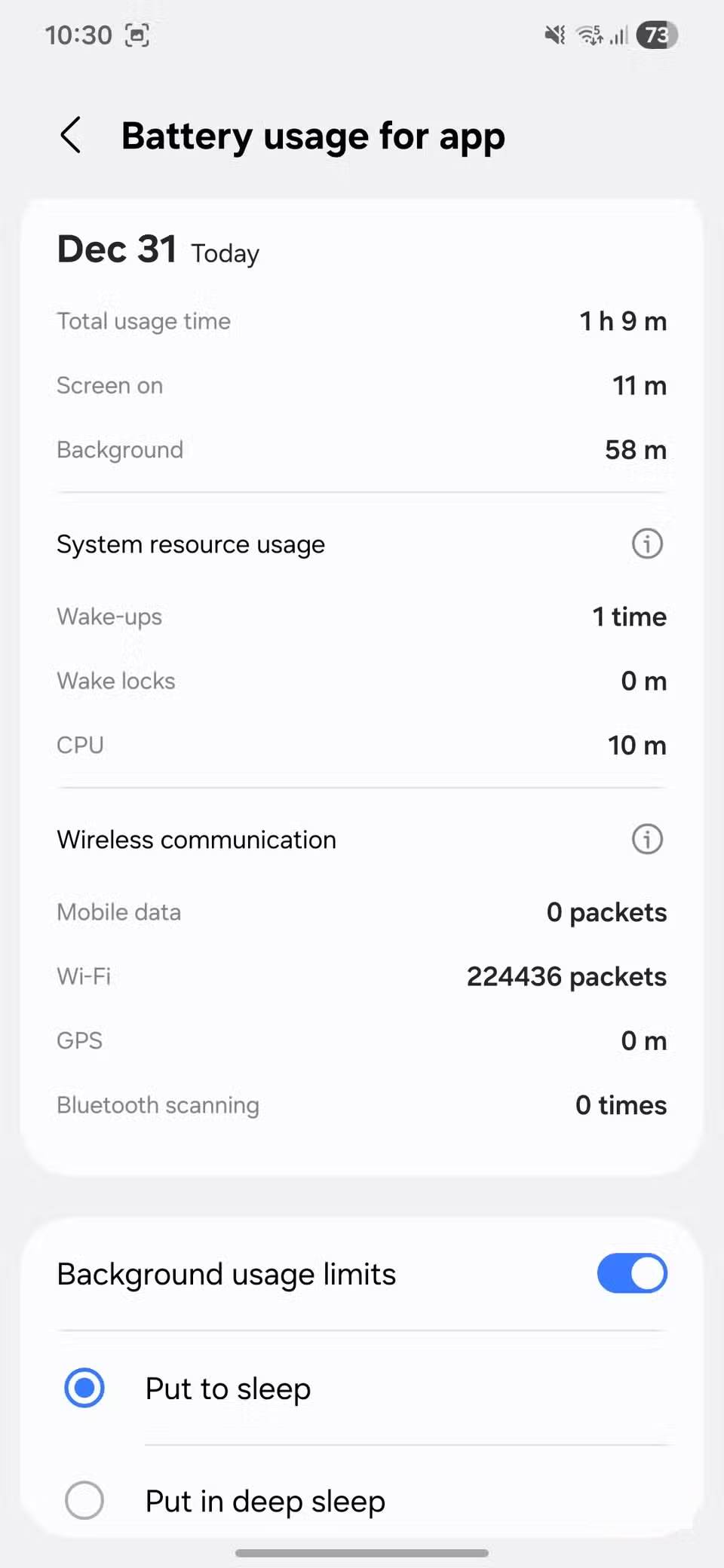 Ngoài ra còn có một cách khác để quyết định xem một ứng dụng có nên ở chế độ ngủ hay không. Hãy vào Settings > Battery > View details. Tại đây, bạn sẽ thấy danh sách các ứng dụng đã tiêu thụ nhiều pin nhất. Nhấn vào bất kỳ ứng dụng nào, và bạn cũng sẽ thấy số lần ứng dụng đó đã đánh thức điện thoại của mình trong nền. Nếu đó là ứng dụng bạn không quan tâm, chỉ cần bật tùy chọn Background usage limits để đưa nó vào chế độ ngủ.