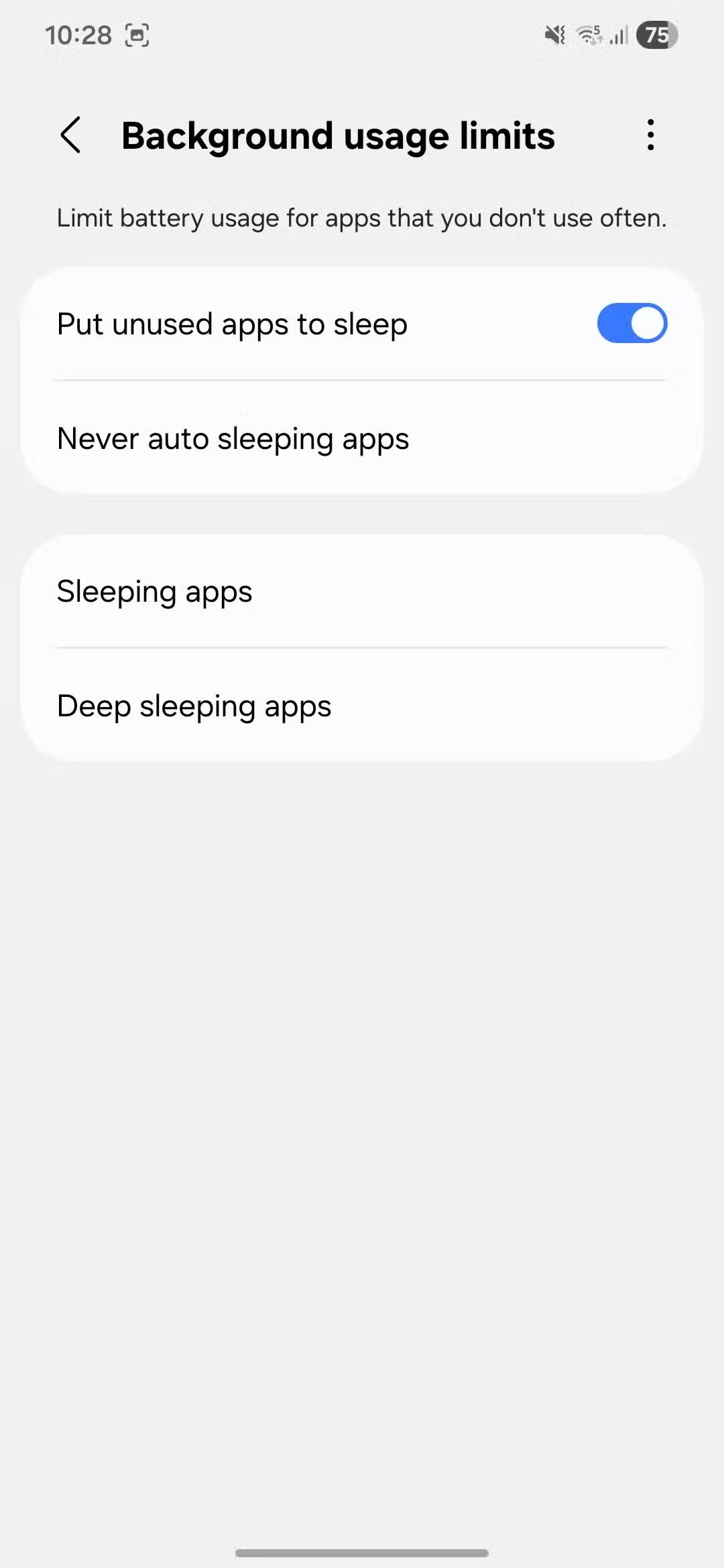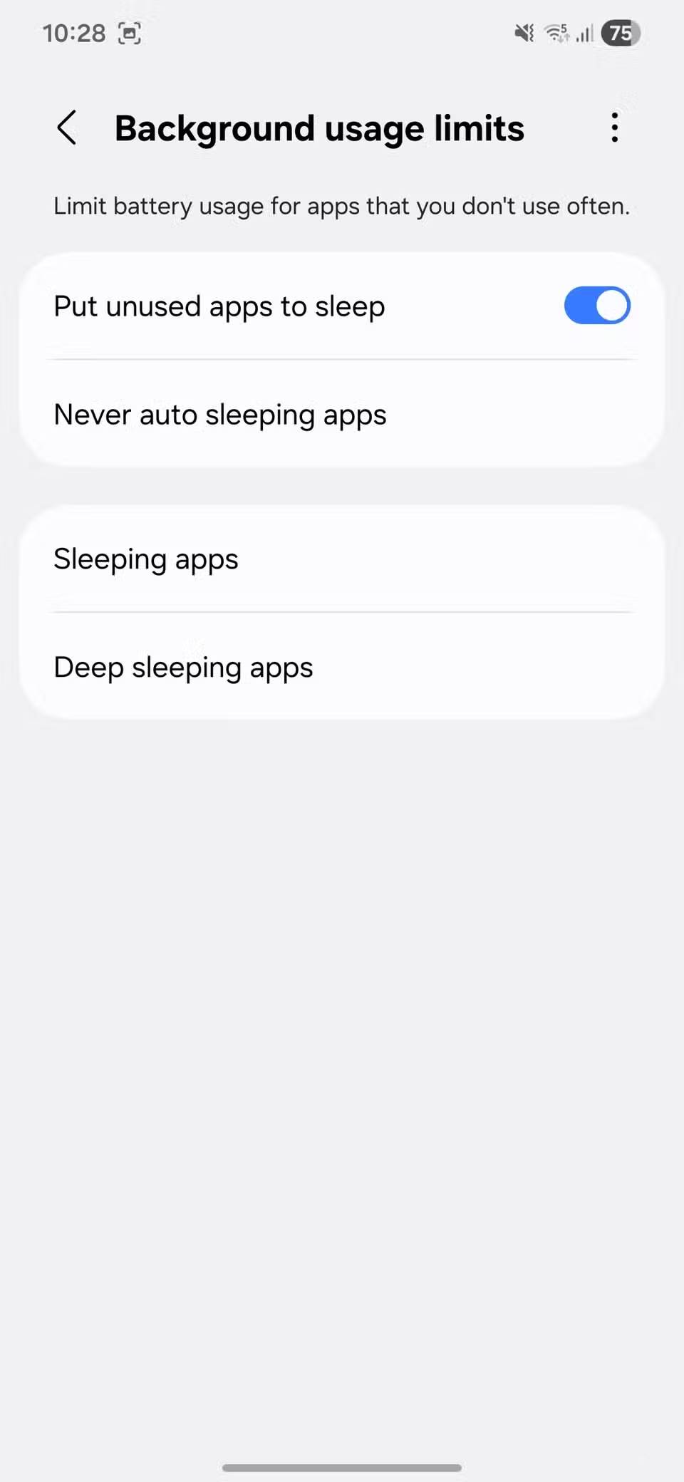 Tính năng Sleeping Apps trong One UI khắc phục vấn đề này rất tốt. Bạn có thể bật nó bằng cách vào Settings > Battery > Background usage limits. Sau khi bật, nó sẽ theo dõi các ứng dụng bạn không thường xuyên sử dụng và đưa chúng vào chế độ ngủ. Về cơ bản, điều này ngăn các ứng dụng này chạy liên tục trong nền và tiêu tốn tài nguyên.