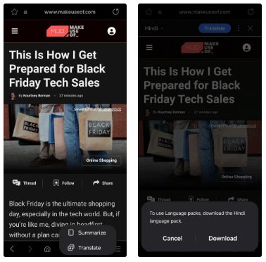 Mặt khác, Samsung Internet cung cấp dịch vụ dịch thuật nhưng lại phức tạp hơn. Nó yêu cầu người dùng phải tải xuống một gói ngôn ngữ riêng để dịch các trang. Ví dụ, khi cố gắng dịch một trang sang tiếng Hindi, nó buộc bạn phải tải xuống gói ngôn ngữ 400MB, điều này không chỉ bất tiện mà còn tiêu tốn dữ liệu di động quý giá khi đi du lịch.